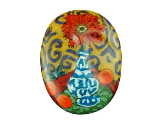 Madeleine O'Connell is a Denver native who is well-known nationally for her vibrant and colorful works. Viewers of her works are drawn to her unexpected compositions that combine rich patterns to form remarkable works. Her mask features a blazing red dahlia and tumbling oranges that catch the interest of a curious cat.