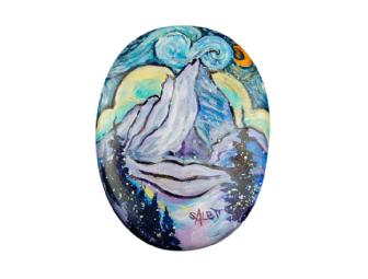 Aspen artist Sue Brinkley Tatem was a biology professor at Temple University for 22 years before coming back to the mountains in 1995 and settling on the Maroon Bells in Aspen as her favorite art subject. Her mask, "Maroon Bells on a Starry Night," is painted with the gusto of Van Gogh and if you take a closer look, you’ll see Mother Nature smiling. A splash of spruce trees, a crescent moon and a spatter of snowflakes give the mask a Colorado garnish. Sue's work has shown in Grand Junction, Denver, Boulder and Aspen. Her paintings are on permanent display in Alpine Women’s Care in Glenwood Springs. She resides mainly in Aspen but lives and paints in Lahaina, Maui and in Stone Harbor, NJ for a few months each year.