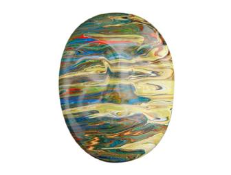 Kenneth Pederson, an artist, telephone engineer, landscape photographer and substitute teacher, used a medium called ?enamel on acrylic? that he invented more than 30 years ago to create his mask. The process consists of oil-based enamel paint on the back of a clear sheet of acrylic. It is partly a reverse-paint process and partly a multi-step, mono-print process, with masking.