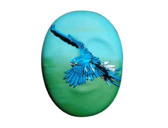 Sarah Speigelman is a junior at Colorado State University where she is working on a degree in veterinary medicine in avian and exotic care. As a young artist, Sarah has a special interest in painting and photographing animals, especially the birds. Her mask was inspired by the Hyacinth Macaw, whose numbers in the wild have decreased to the point of endangerment. They are gentle and social creatures with a remarkably high intelligence. Sarah's mask is an example of the beauty that will be lost if we don’t make an effort to protect the animals around us.