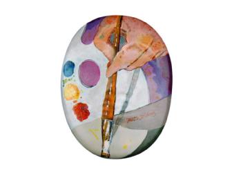 Jared Steinberg is an artist and Denver Native. He is an active member of the River North Art District and is involved at the Art Students of Denver where he continues to expand his artistic foundation. In March 2007, his open studio show "Slices of Denver" was featured in 5280 Magazine. Steinberg continues to have open studio events on most First Fridays at his Yellow House Studio in downtown Denver. The artist titles his mask "Color Theory 101" and describes that his piece "reveals who I am as an artist...as with all of my paintings, I’ve employed all 6 hues."
