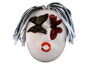 Opera lover Ellie Caulkins, for whom the opera house at the Denver Center for the Performing Arts is named, calls her mask, "Madame Butterfly," which will be performed by Opera Colorado in November 2008 at the Elle Caulkins Opera House. The mask's "hair" is crafted from the musical score.