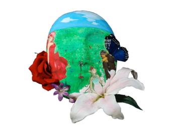 Keely started her art career at age 8 with the Loveland International Show and sale, and has been creating art for 9 years. Her mother, Charlotte Kuhl, was the main source of her inspiration and creativity. Her mask represents the sense of a hot summer day in a field of wild flowers, with the untrained human eye missing the detailed beauty of the landscape, including the many "sprites that converse with each other."