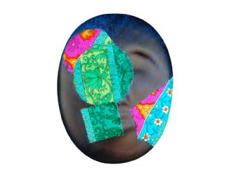 Denver-based fiber artist and writer Cyndeth Allison calls her mask "Reincarnation." In 1972, when she graduated from college, she made a dress to wear to her first "real" job. But she never finished hemming it and never wore it but she kept it because she loved the fabric. "This is that dress!" she says.