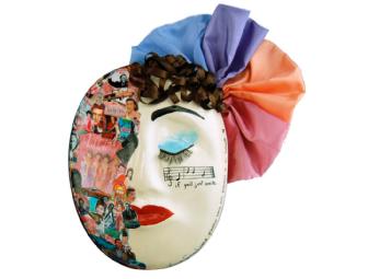 The Taffetas based their name on the real Chiffons and gained fame with a revue of 1950's songs that bring back images of poodle skirts, dates at the soda fountain, the Bunny Hop and guys who signaled approval by saying "hubba, hubba." Those images, as well as pictures of cars with big tail fins and Elvis, cover the mask's right side, leaving the other side as a red-lipped woman’s face featuring long eyelashes and curly brown ribbon hair. As the slogan says, "If you’ll just smile...”