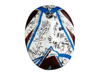 Kroenke Sports painted a mask in the colors of the Colorado Avalanche colors and arranged for the entire team to sign their mask for The Mask Project.
