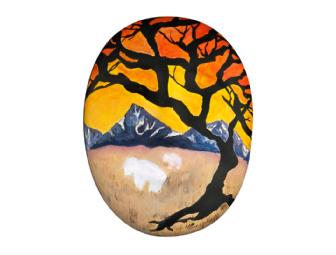 Anna Mills has been teaching middle school for seven years and still loves it! She is a Colorado native and teaches at Campus Middle School in the Cherry Creek School District. Her mask, with a sunset and two white buffaloes, represents peace. The tree is not yet in bloom which means that there is the hope of spring and the peace to come in this world!