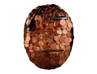 Mike Landa created this mask for Rocky Mountain News columnist Penny Parker featuring shiny new pennies and a Parker pen – thus, Penny Parker.
