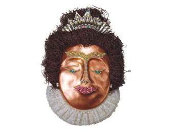Melissa Scott, an artist/designer, created her mask "Queen of the Kitchen-The Domestic Goddess" for Sur la Table. Scott used all culinary items from the store to create the mask: copper for the best cookware, food decorating points, tart tins, ruffle and multi-colored dragee as detail and their signature color packing material as hair.