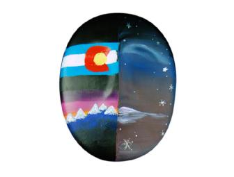 Sean and Julie have been friends for several years, and both enjoy skateboarding and snowboarding, and share an appreciation of art and a love of creating it. Both also consider helping people as their forte. With different styles of painting, their passion for helping others made this the perfect opportunity to collaborate. Sean's side of the mask exemplifies the vibrant, creative lifestyle people of Colorado exude. Julie's side represents the happy calm of breathing in the cool Colorado night air, gazing at too many stars to count, and the feeling of snowflakes tickling her nose.