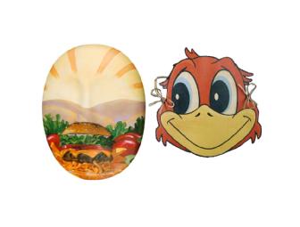 Bret Bertholf, a Denver artist, writer, musician and yodeler with a country-western band created the mask for Dennis Mullen, CEO of Red Robin Gourmet Burgers, the Denver-based national restaurant company. The artist is a graduate of the Rhode Island School of Design. His mask pays homage to Red Robin's culture which is best described as a healthy dose of fun with honest to goodness ingredients. It looks good enough to eat. Yummm!