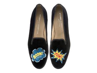 This new Stubbs & Wootton original slipper features onomatopoeia on each foot; Pow! on the left foot, and Boom! on the right foot. Set on black velvet, these colorful designs are very versatile. Trimmed in black grosgrain, with a black heel and sole.