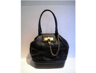 Black lamb leather. Goldtone hardware. Top handles. Open top. Front flap closure with hanging chain detail. Made in Italy.