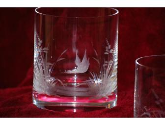 Bid on a gorgeous set of 6 double old-fashioned hand etched crystal glasses. Each glass is beautifully etched with a duck motif. They would make a great addition to any bar!