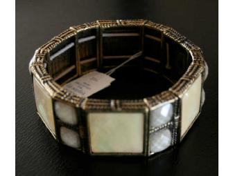 Genuine Mother-of-Pearl with a color spectrum from lustrous creamy white to ivory, set in a antique gold finish.