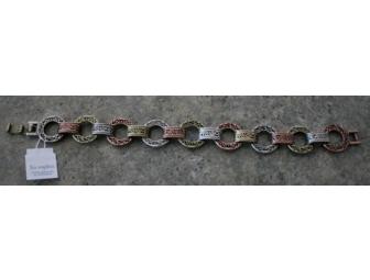 Stunning mixture of silver, gold, and bronze filigree embossed circular shapes. Matte finish.