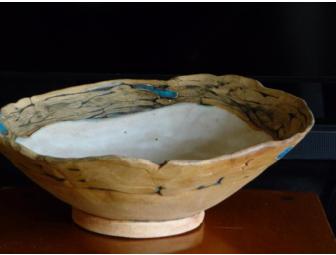 Our congregant Cynthia Schneider creates beautiful ceramic pieces -- and now you can own one of your own. This bowl is about 11" in diameter, 4" high, with a pale glaze in the interior, and stained with various earth tone oxides and glazes. Not suggested for food, but can be used as a fruit bowl or for other dry items.