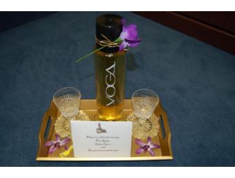 Elegant touch for fine dining. Includes Viga Italia Pinot Grigio Italian Import with two crystal glasses and gold-painted serving tray.