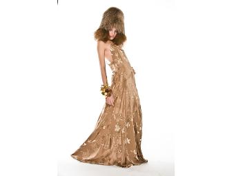 Warm Taupe Silk Charmeuse with gold lurex dogwood-flower jacquar echoes the vintage feeling of patchwork lingerie in this effortless bias-cut gown.