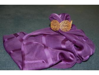 Dress up for the evening with this beautiful purple scarf, shimmery and classic. You can also accent your outfit with this elegant gold bracelet, with elastic trim to fit all wrist sizes.