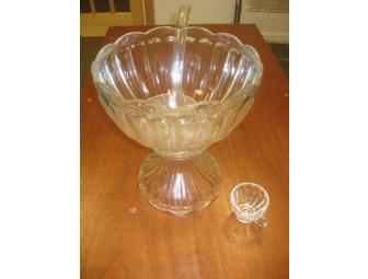 Colonial-style etched punch bowl (stand is 5.5" high, bowl is 8" in height and 12" in diameter) and 12 matching cups with hooks.