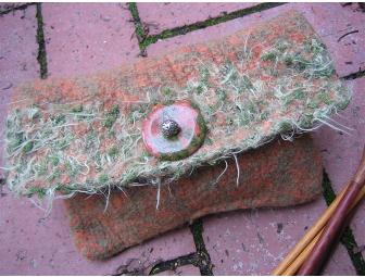 This is a darling hand knit wool purse adorned with fun and fuzzy green nylon - a beautiful Coren Macy creation!