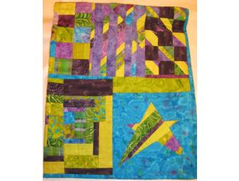 This is a beautiful handmade quilt with striking designs and penetrating blue, green and purple hues. A truly amazing creation from Crestmont Alumni parent Leah Statman!