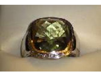 Stunning is the only way to describe this. This is an excellent quality green amethyst over 7 ctw and surrounded with pave diamonds. This multifaceted stone is cut intricately in a very unique style allowing for ultimate sparkle and irridescence. The ring is set in a wide band of white gold. The picture does not do the ring justice! The ring will be showcased at the Book Fair and at A Night in Rio. If you would like to set up a personal appointment to view the ring, please email hawktion2007@yahoo.cm