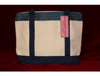 You will love this sturdy canvas tote bag! It is trimmed with one of Vineyard Vines signature silk patterns and measures 17" wide X 12" high. Handles also measures 12" high. This great tote has several interior pouches, one zippered compartment and a zip-top closure.