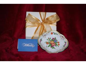 Bid on a set of two beautiful hand painted Mottahedeh Williamsburg relish bowls. They are from the Duke of Gloucester Dinnerware and Accessories collection. Around 1770, the Duke of Gloucester, William Henry, commissioned a dinner service featuring a design of fanciful fruit clusters with attendant insects in brightly enameled colors and gold cartouches. The relish bowls reflect this design. Each bowl measures approx. 6" long by 5" wide.