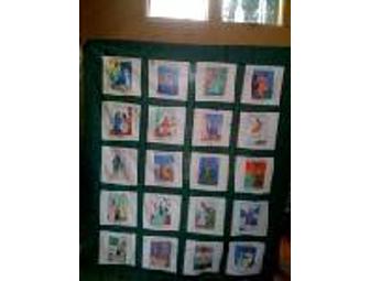 This unique handmade rosary quilt is made with lots of love from the first graders at Cedarcrest. Each student has colored a square on this quilt that represents one of the 20 mysteries of the rosary.  Created with excellent fabric, batting and stitching, the quilt is machine washable and dryable - on the gentlest cycle. The art materials will not run, but will fade slightly with washings, as most heirlooms do.