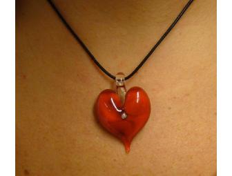 Hand-blown by Providence glass artist Chris Belleau, this gorgeous and graceful glass pendant measures about 1.5" high from the glass loop to the bottom of the heart. It hangs on a 18" thin black leather cord, which can be easily alternated with a silk chord or chain of your choice.