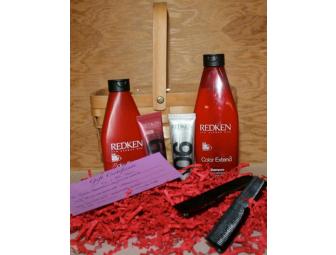 This gift basket is filled with Redken Color Extend products. To top it off you will also receive a gift certificate worth $43 towards any service from owner, Mary.