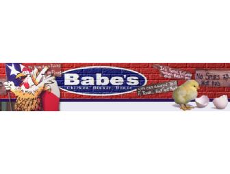 This auction item is for Dinner for 2 at any of the following locations: Roanoke, Garland, Snager, Frisco, Carrolton, Burleson, Granbury or Frisco. So, no matter where you are in the Metroplex, there's a Babe's near you!