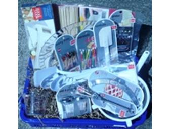 This reusable tray is filled with an acrylic egg plater, cheese shaker and salt & pepper shakers, a plastic spatula, a plastic spaghetti spoon, large spoon & large slotted spoon, bamboo skewers, , cheesecloth, a strainer, a flexible spatula, a Mandolin Slicer, a 1-cup measuring cup, a whisk, and a pie crust shield, a grater and a set of large flexible cutting boards.