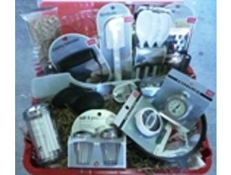 This reusable tray is filled with an acrylic egg plater, cheese shaker and salt & pepper shakers, a set of plastic spoons, a plastic spatula, a hi-temp large spoon & large slotted spoon, a pastry blender, bamboo skewers, an oven thermometer, a digital timer, cheesecloth, a strainer, a flexible spatula, a grater and a set of large flexible cutting boards.