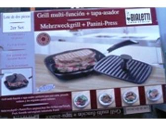 Bialetti introduces a multi-purpose grill and panini press that grills paninis, meats, veggies, and more! This two piece set includes an 11 x 11 grill with a Duratek non-stick coating that is safe for all utensils. Also included is a cast iron, non-stick press with ridges and bakelite knob. It features a black porcelain enamel exterior and an ergonomic silicone handle that is oven safe up to 450 degrees. The large grill can be used a a steak griller when not using it as a panini grill.It also includes an oversized gift box with attractive photographs and descriptions . Dishwasher Safe. Made in Italy with 15 Year Warranty .