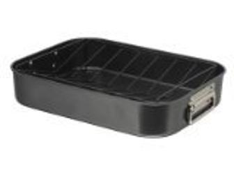 Non-stick coated steel measuring 17 3/4"x14"x3 3/4". Riveted folding handles for easy carrying.