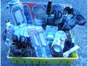 Yellow tray filled with an Oneida 5" mini chef knife, an 3.5" Oneida paring knife, an Oneida large chef knife, kitchen shears, stainless steel large spoon, stainless steel large slotted spoon, 2 stainless steel spatulas, stainless steel large serving fork, stainless steel masher, a refrigerator/oven thermometer, large flexible cutting boards, stainless steel measuring cups, a 1 cup and a 2 cup measuring cup, a 3-in-1 can opener, an ice cream scoop, a melon baller, measuring spoons, large mixing spoons, a set of wooden spoons, a flexible spatula, a grater, a vegetable knife, a whisk, tongs, cheesecloth, a vegetable brush and a gravy whisk.