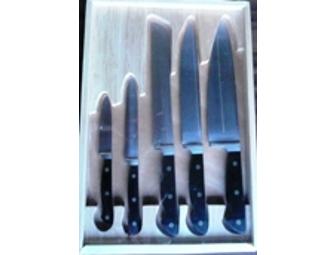 A 5 piece Cook's Essentials knife set in a wood case with an acrylic see-thru lid. Set includes paring knife, utility knife, bread knife, and two chef's knives.