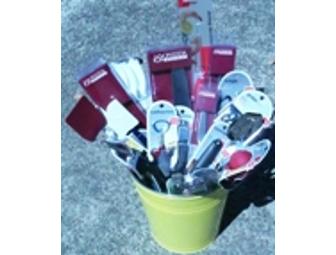 A large yellow metal pail that could be used for ice or planting filled with, a sturdy red silicone spatula, a 2 piece Oneida Oriental Chef knife set, Oneida kitchen shears that can cut through bones, a 6" Oneida boning knife, a 3.5" Oneida paring knife, two large stainless steel spoons (one slotted), a garlic press, a zester, a melon baller, a meat tenderizer, a peeler, a grater, a baster, a stainless steel spatula, a stainless steel large serving fork, a shrimp deveiner, a bottle opener, tongs, mixing spoons and a cutting board.
