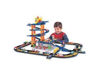 An exciting new place for you and your vehicles to explore. Drive in and around the Action City Parking Garage and discover the gas station, snack shop and four parking-garage levels. Insert the plastic card and the gate on the fourth level releases, letting your vehicle speed down toward the bottom. There are two ways to exit the garage; just turn the switch to choose. Playset comes with four die-cast vehicles, including a helicopter that can "take off" from the landing pad on the roof of the garage.