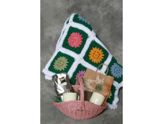 The winner of this auction will receive the Granny Square afghan made with various colored flowers with a green and white border. Also included is a fabulous basket with a 2 lb. package of Starbucks coffee, 2 mugs and a notepad.