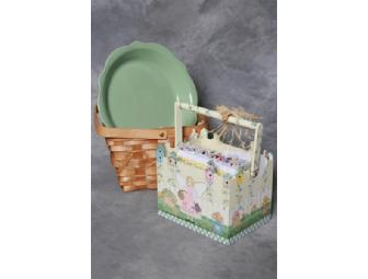 This adorable country hand painted wooden card file features a cute little angel, birdhouses and flowers. Painted sweetly with pastels, this little box will fit in with any country decor. Included inside the card file are various greeting cards to use for upcoming occasions in your life. Also included with this auction item is a lovely matching sage green ceramic pie plate which is oven and microwave safe.