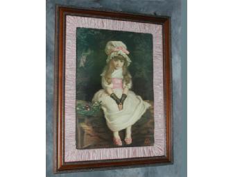 This piece is in a word, "precious." Take a look at the innocent sweet face on this little girl and just imagine what she must be thinking. All dressed up in her cream colored dress and hat with matching pink sash, shoes and ribbon and fancy black gloves, this little girl looks ready for a very special occasion. Framed in a fabulous dark wood frame and gathered pink satin mat, this piece is a definite crowd pleaser. Could be paired with item #2013 for a very delightful and whimsical set!
