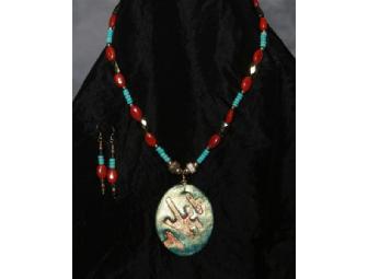 This gorgeous necklace and earring set is an original from Kay Donahue. This signed penant with tourquoise and gold filled beads accented with Swarovski crystals is sure to become a favorite in your wardrobe.