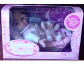 13" Baby doll with wicker basket, teddy bear, blanket and pillow.