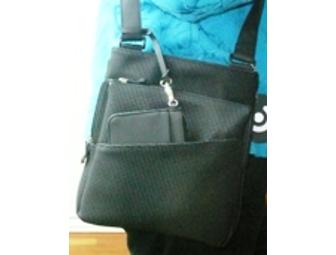 Adjustable crossbody in our Microfiber and goat skin leather Top zip closure, exterior front zip pocket, adjustable crossbody strap Fully lined in Vintage Travel sticker fabric with double open pockets, vertical credit card wall, cell phone pocket and a double open pocket/pen combination interior Shiny Nickel Hardware<>Strap drop 26"