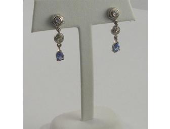 Ladies 18 karat white gold earrings set with four (4) diamonds that weigh 0.20 carats total weight and two (2) tanzanites.