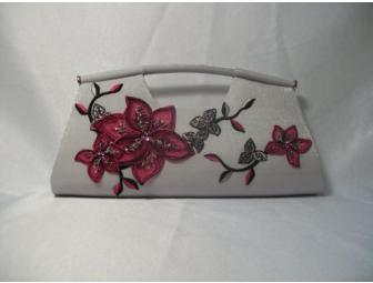This gorgeous light grey evening bag features fuchsia, black and silver flower appliques and black stems. The rounded bottom purse has an arched carry handle with mirrored ends and a 21.5" braided cord strap that conceals within the bag. The purse if fully lined and has one interior pocket.